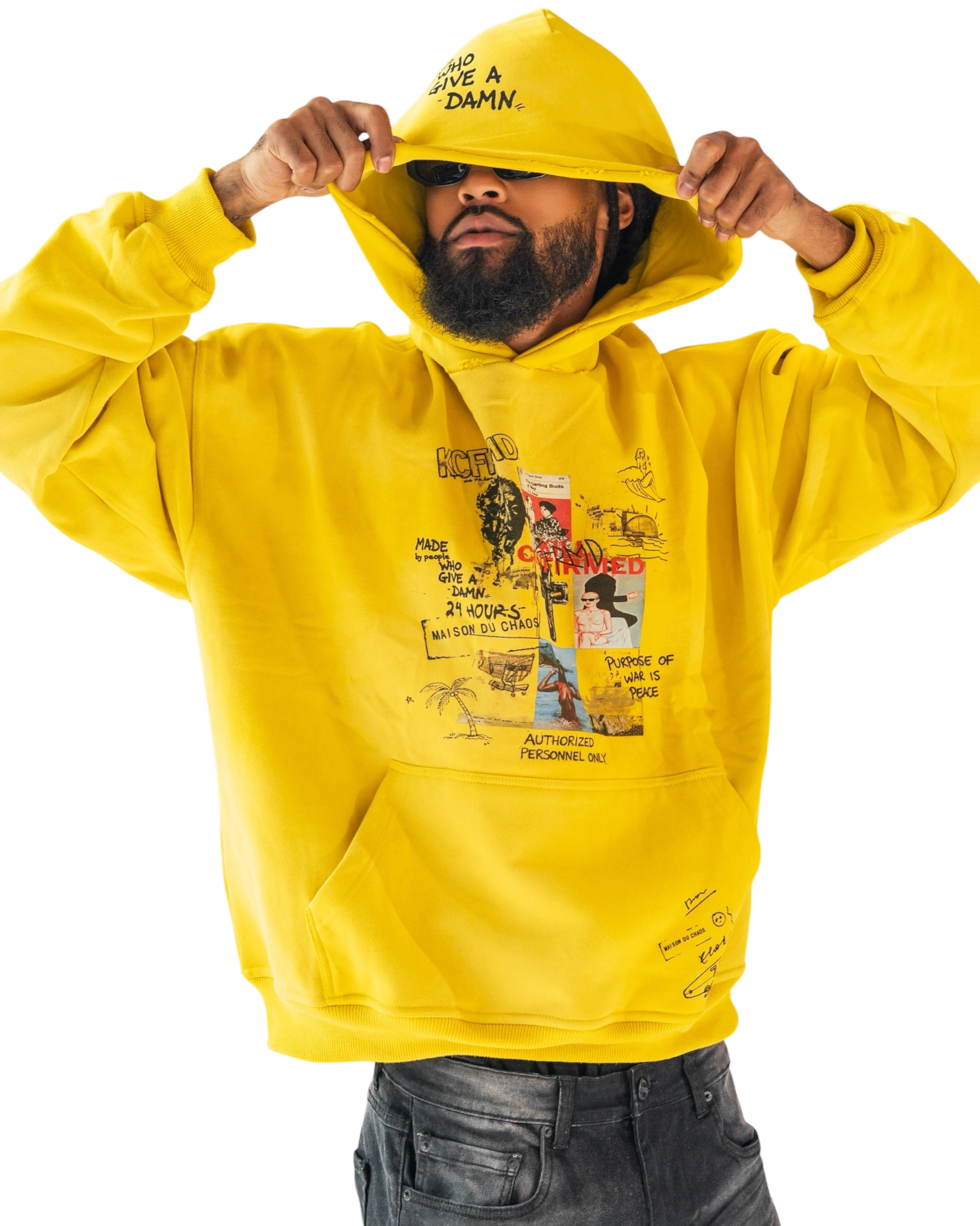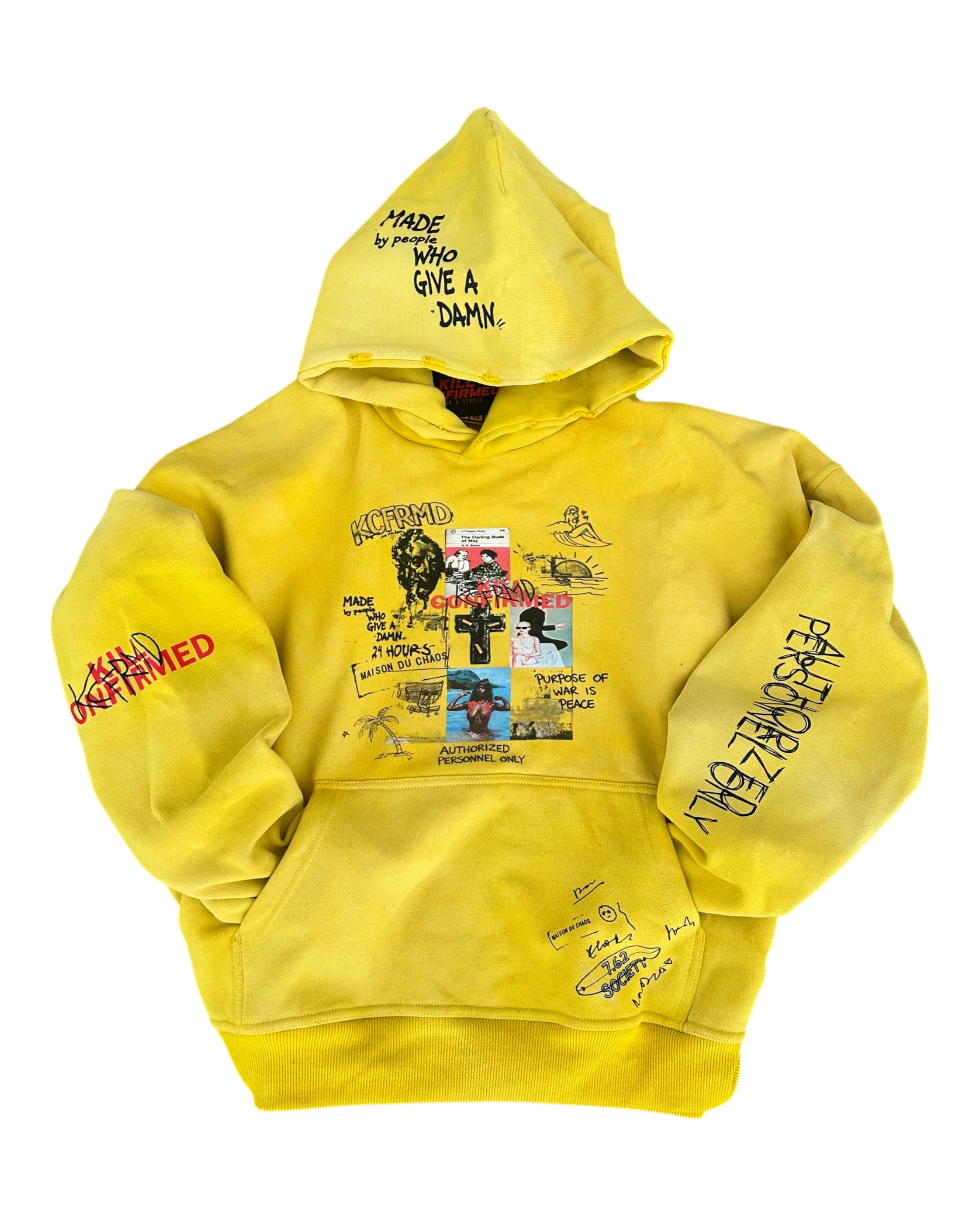- Distressed hood edge with interior statement text